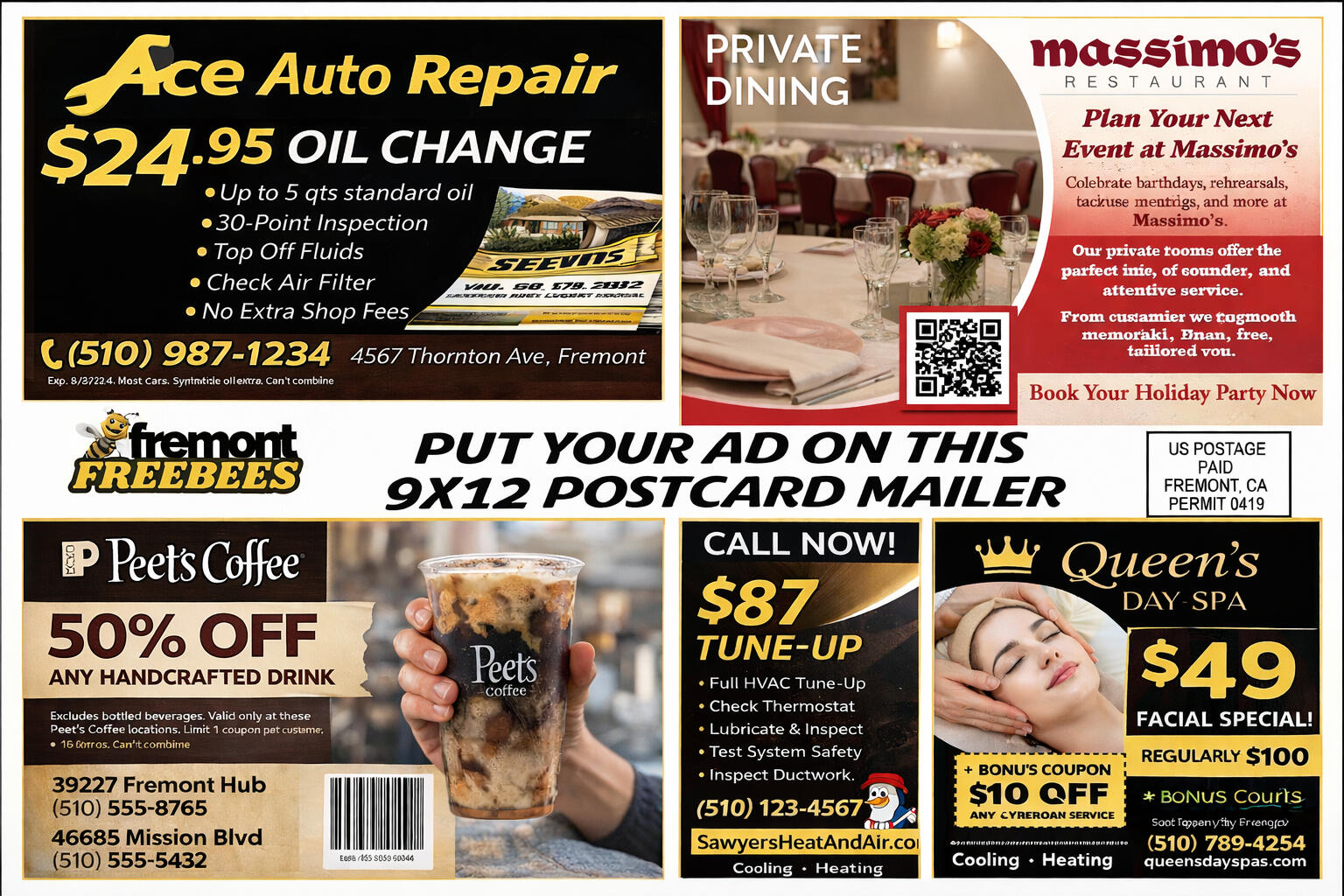 Fremont Freebees is a shared 9x12 postcard mailed to 10,000 local homes.Instead of spending thousands on your own…